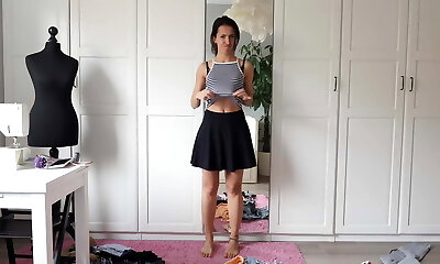 Mature brunette Karina gets her jean skirt and liquidated and has pantyhose hookup