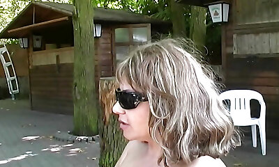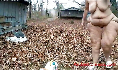 Striptease and Piss by chubby Mature naked blond outside in the garden courtyard