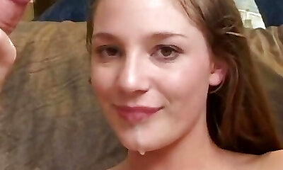 Uber-cute superslut takes dick in mouth, twat and ass then jizzed on after sucking 2 dicks