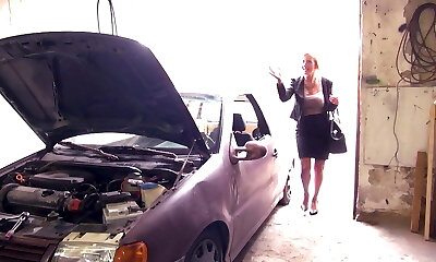 Brit big boobed blonde Katie Kaliana sucks and drills big dick Mechanic Andy Mann in the repair garage